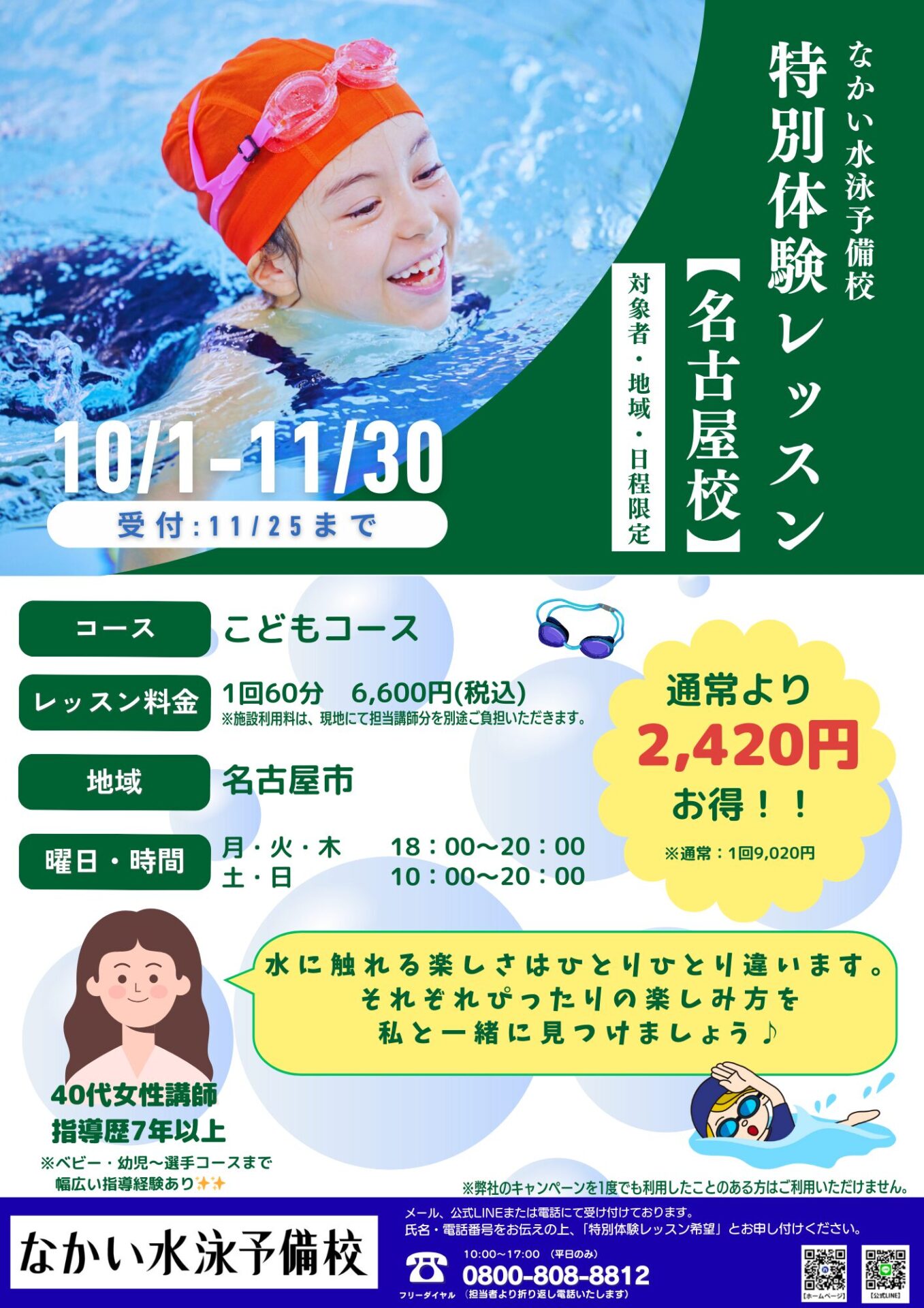 なかい水泳予備校 名古屋校では、こどもコースを対象に、期間限定で「特別体験レッスン」を実施いたします。
